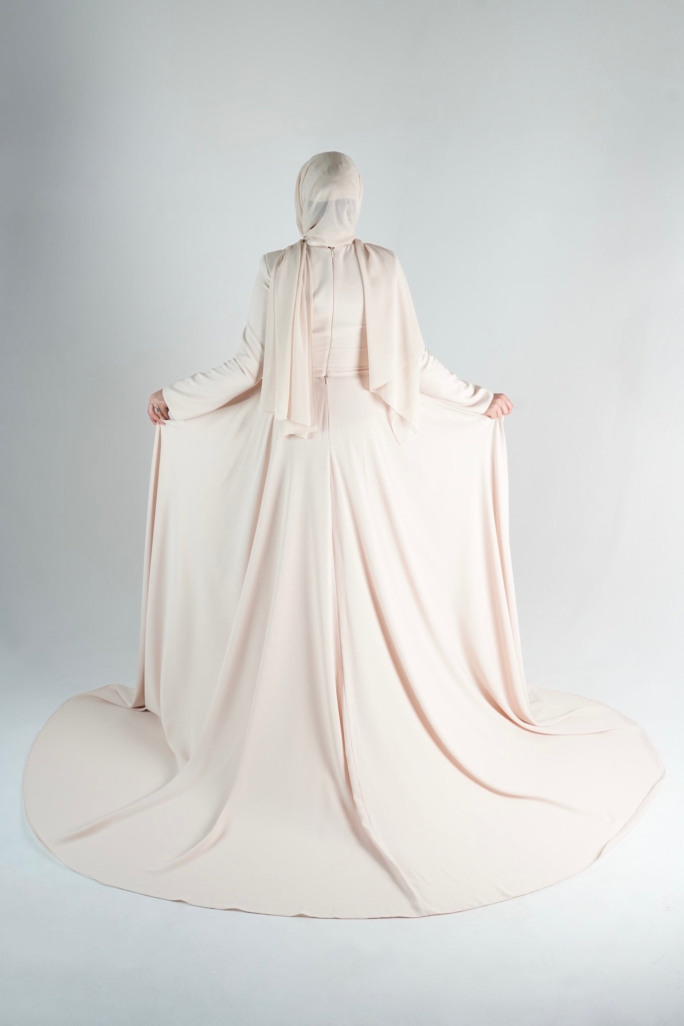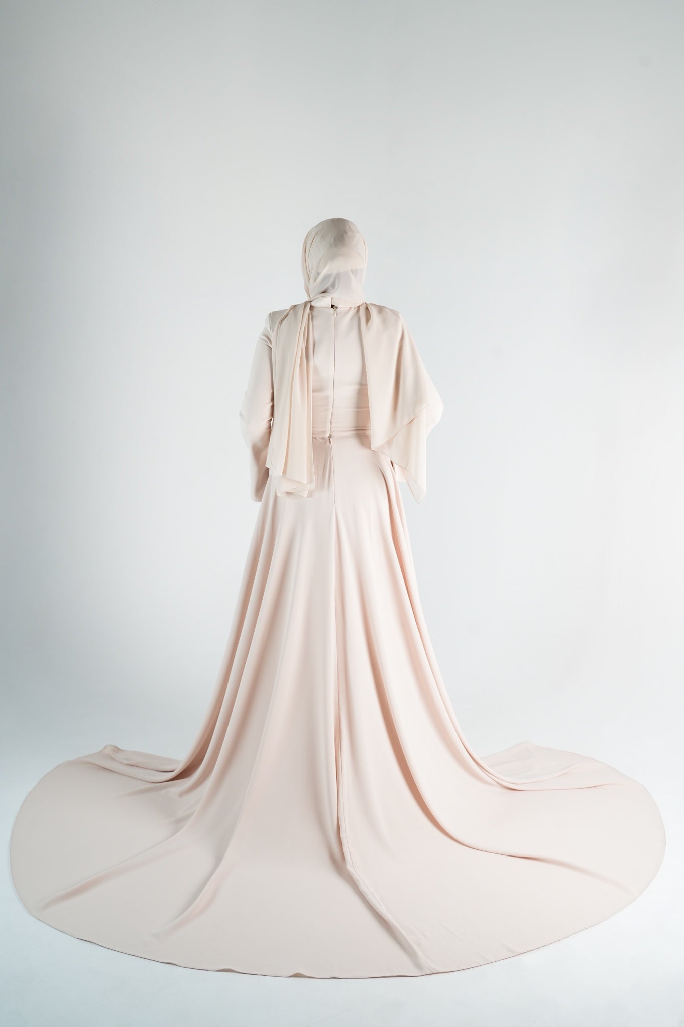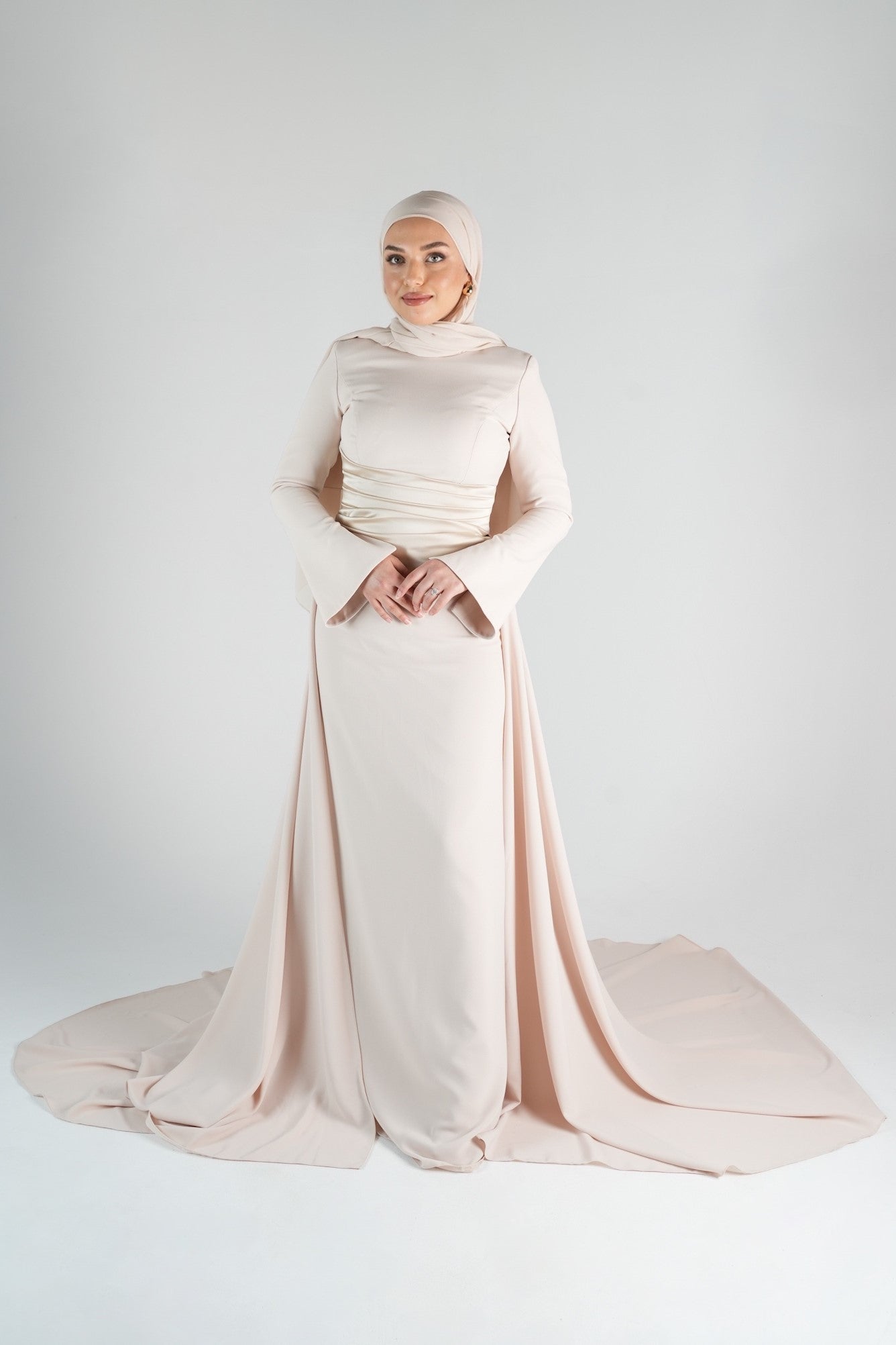 Fest vernähte lange Schleppe (nicht abnehmbar) für einen besonderen Auftritt