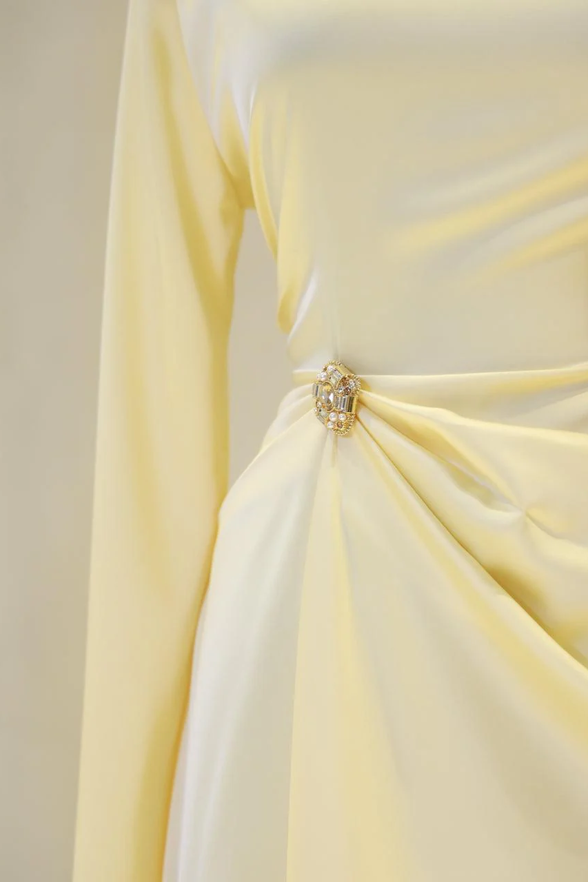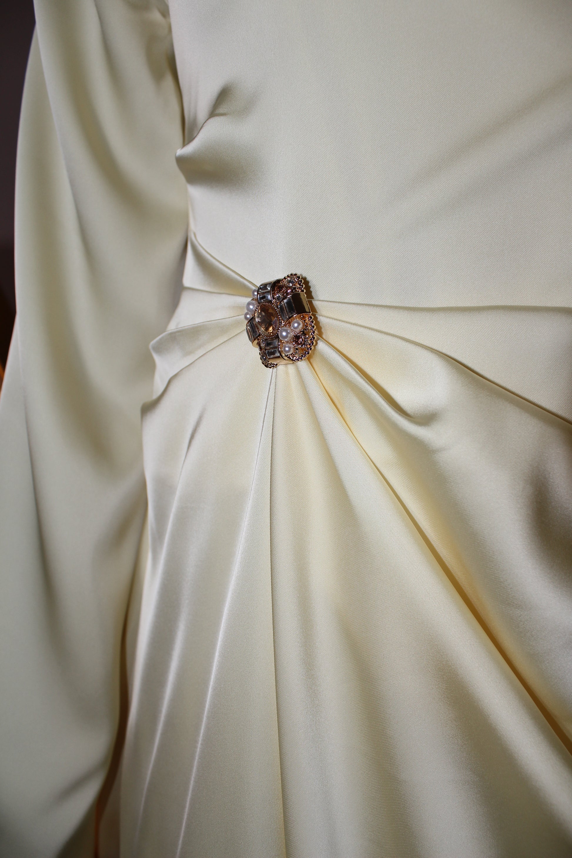 • Dezente Drapierung mit Brosche als stilvoller Akzent (Brosche wie auf der Puppe)
