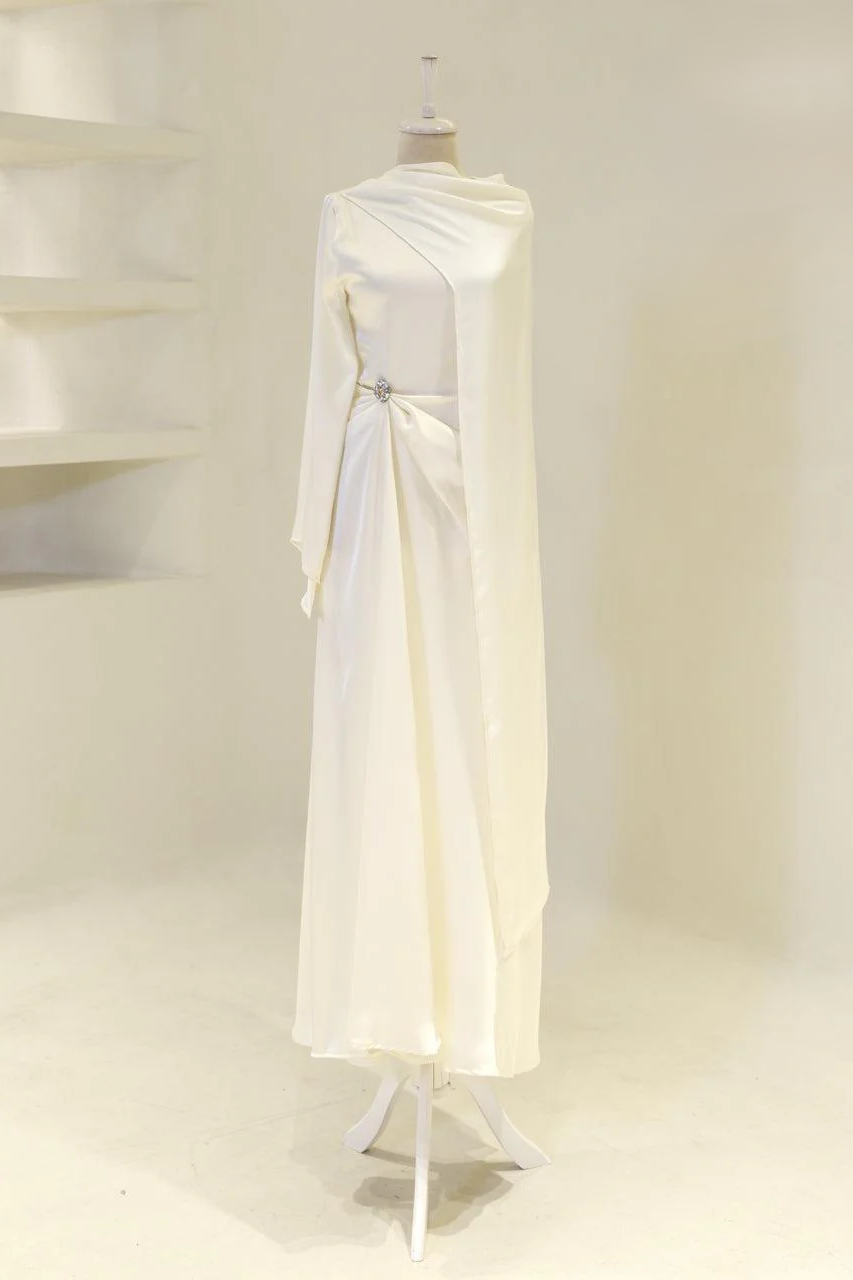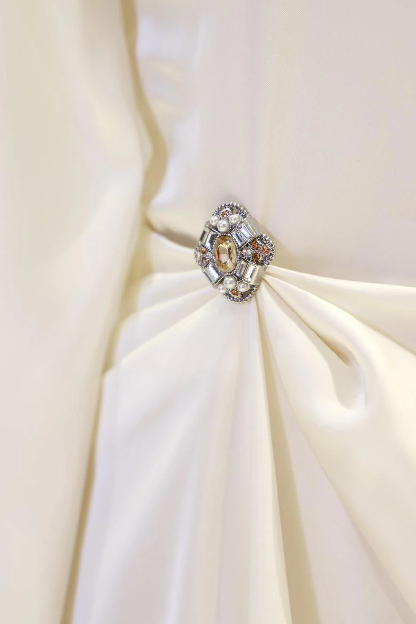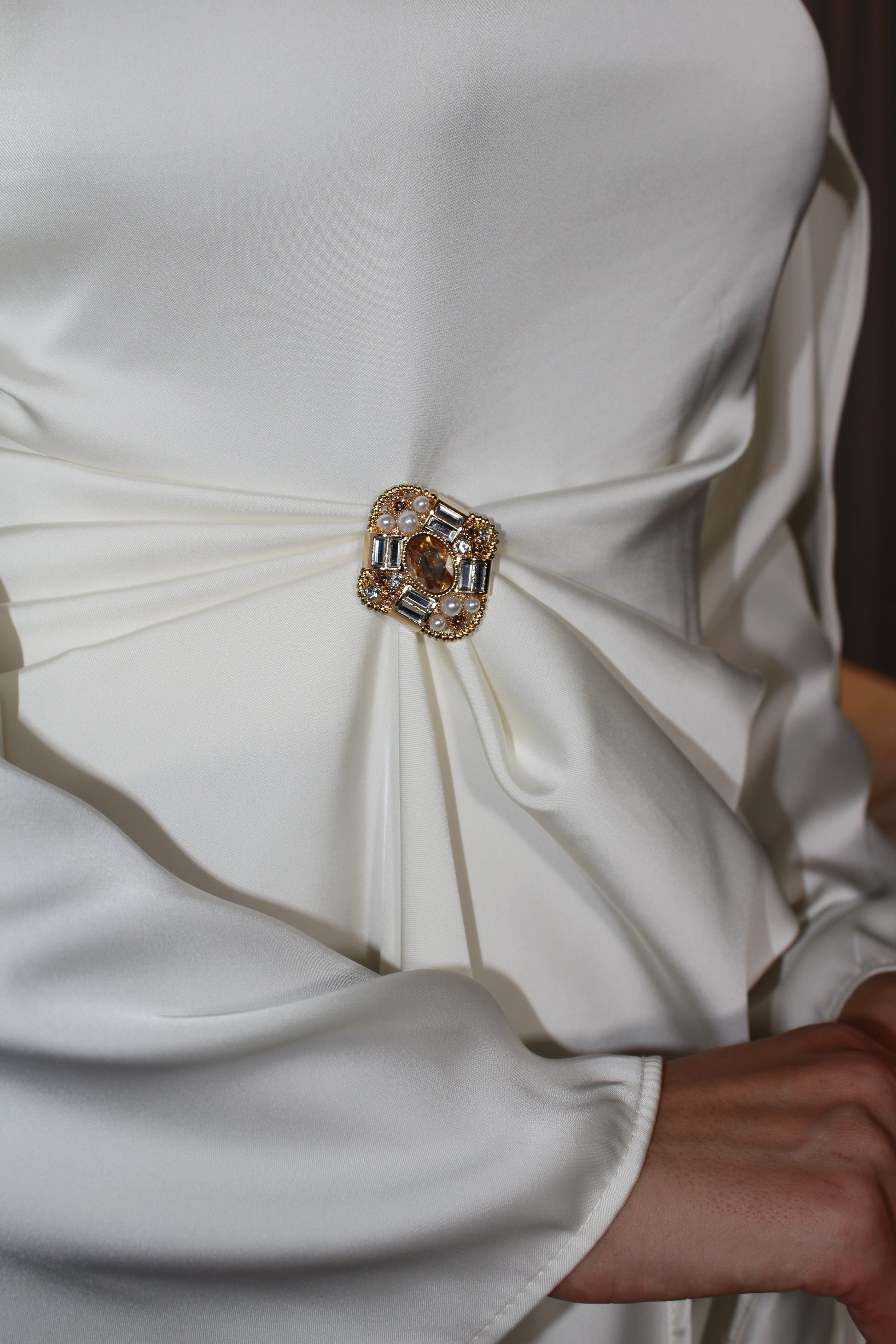 • Dezente Drapierung mit Brosche als stilvoller Akzent (Brosche wie auf der Puppe)